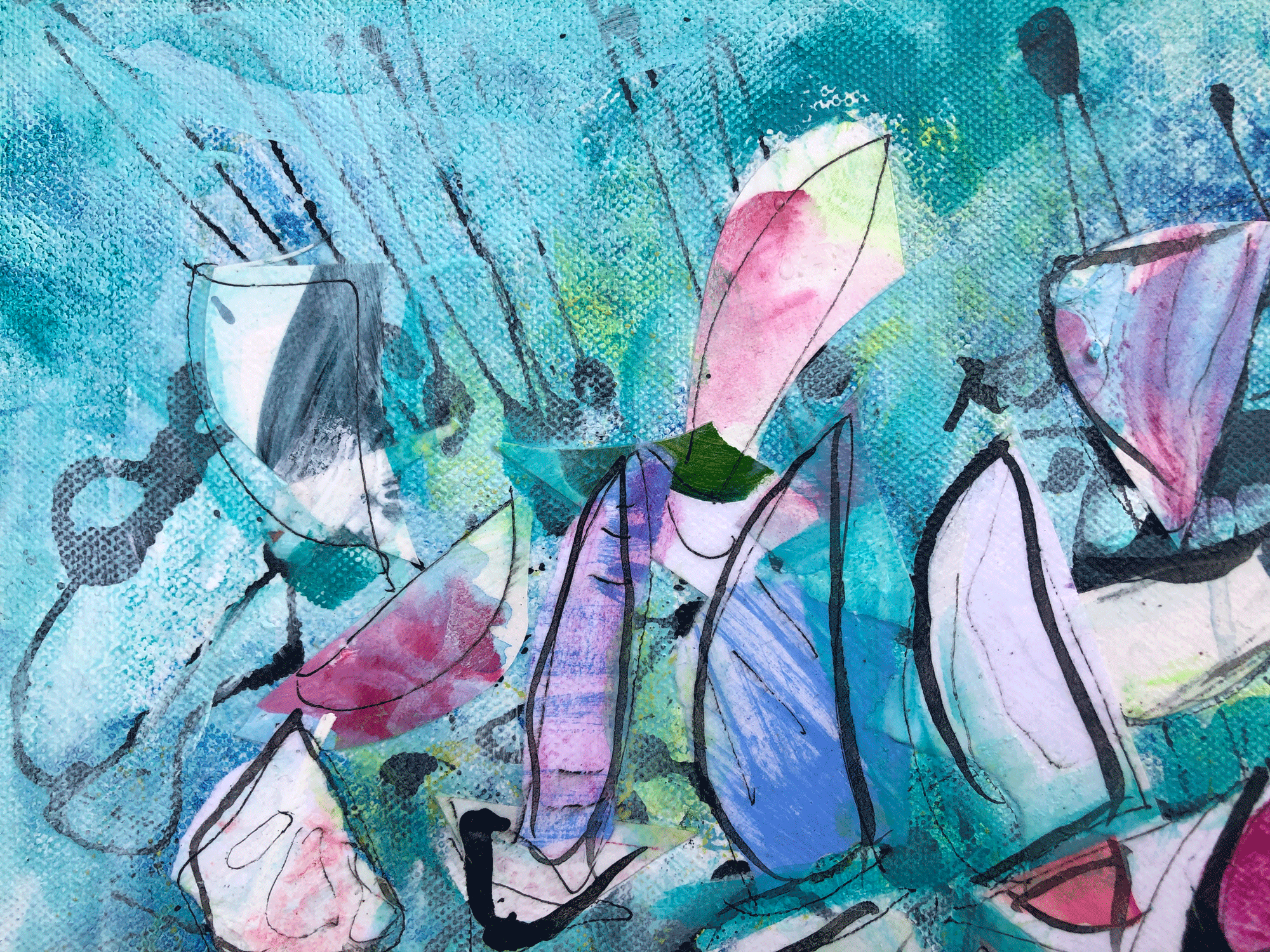 In this vibrant composition, sails unfurl like flames, their edges kissed by the sun. Aqua, pink, and green hues collide, swirling in a chaotic ballet of wind and water. The textured background mimics the tumultuous sea, echoing the adrenaline rush of full-speed sailing.