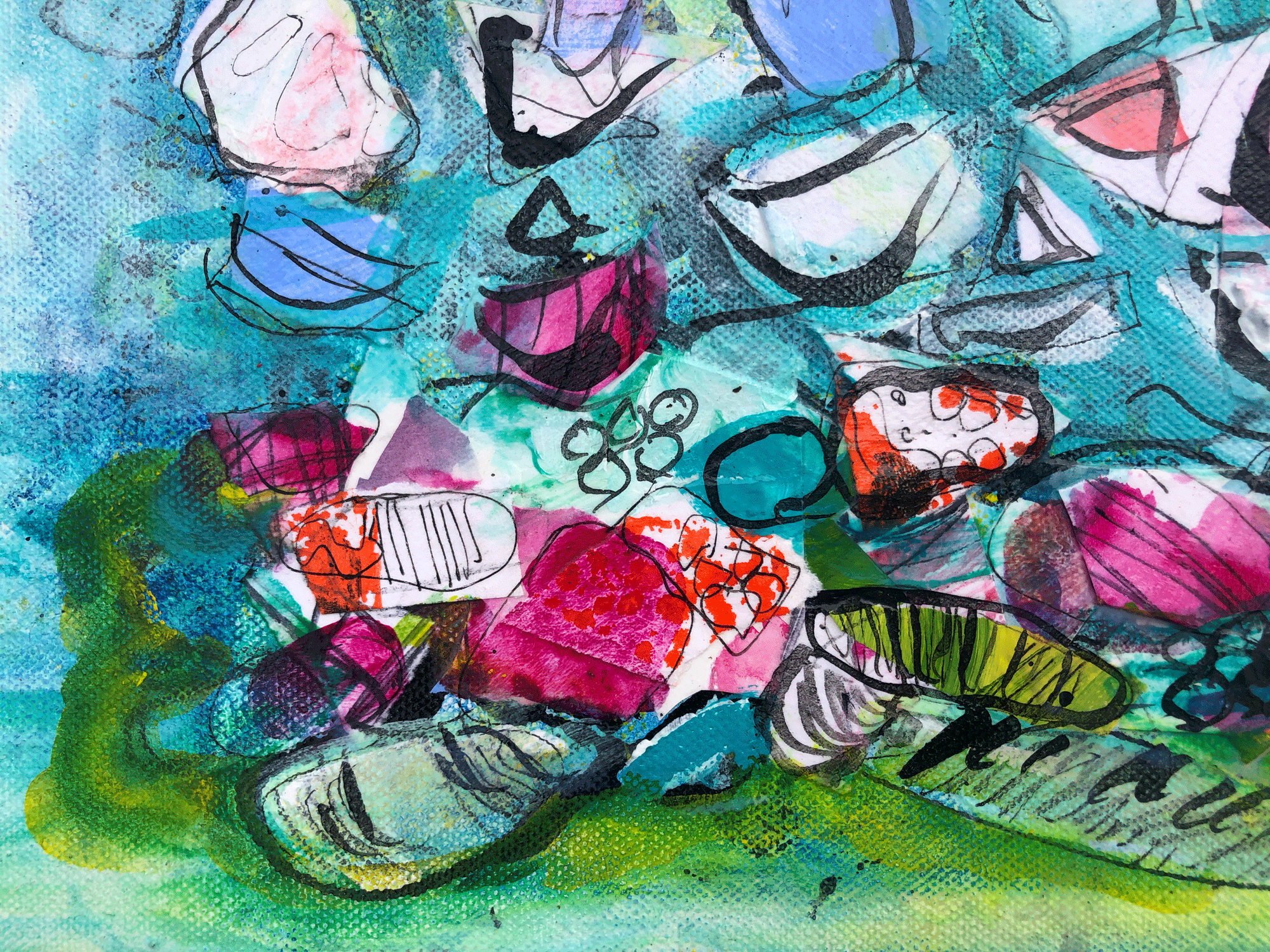 Mixed media including acrylic paint and painted collage papers on stretched.
