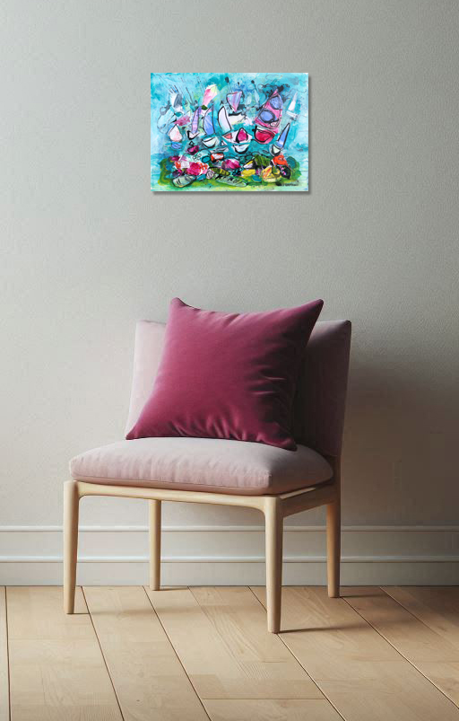 In this vibrant composition, sails unfurl like flames, their edges kissed by the sun. Aqua, pink, and green hues collide, swirling in a chaotic ballet of wind and water.