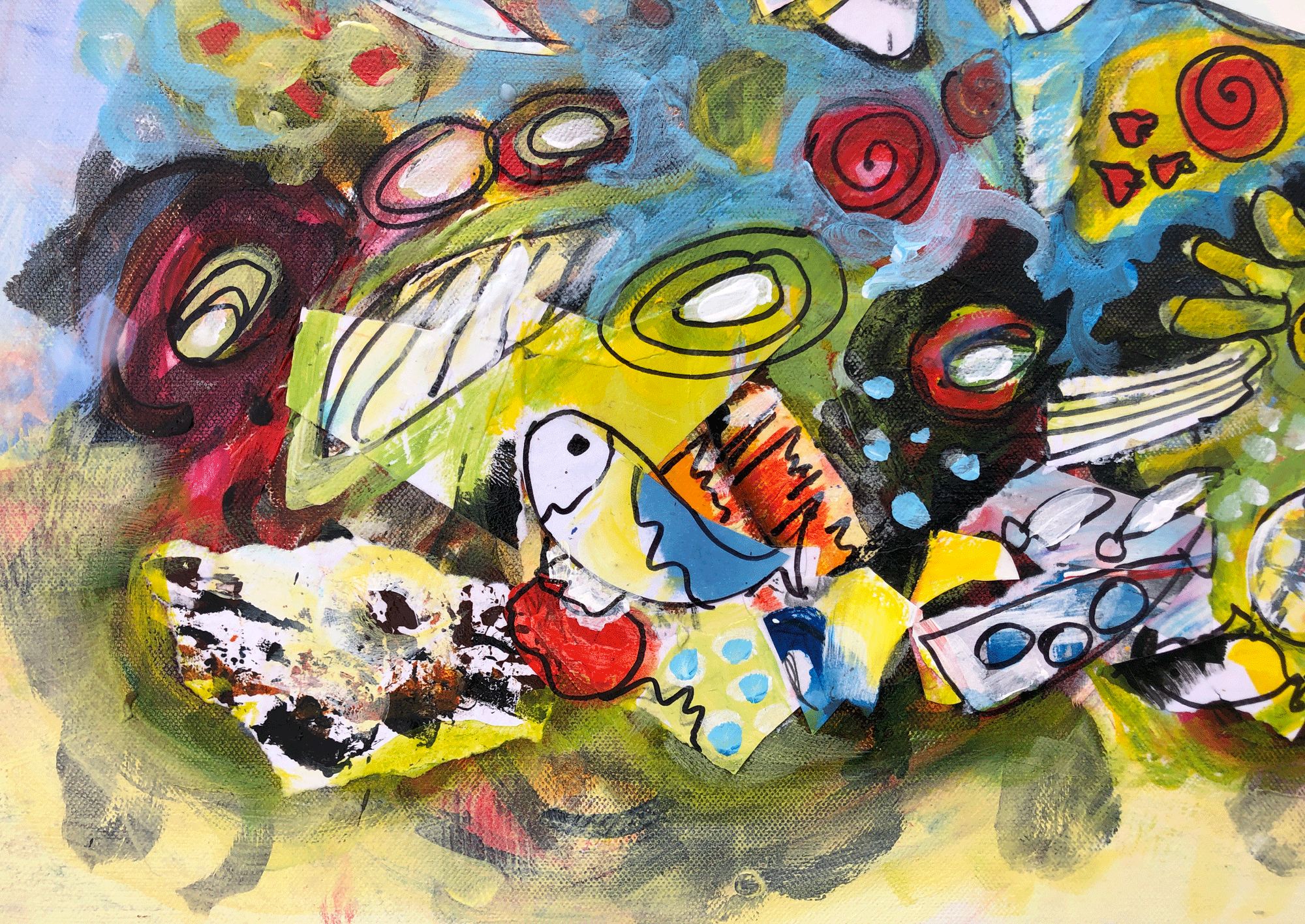 This original, contemporary artwork has been built up in many layers of mark making, acrylic paint and painted collage papers to create a rich, deep, textural artwork, full of vibrancy and energy.