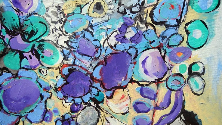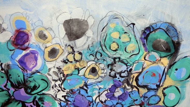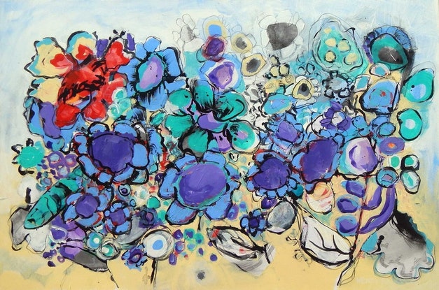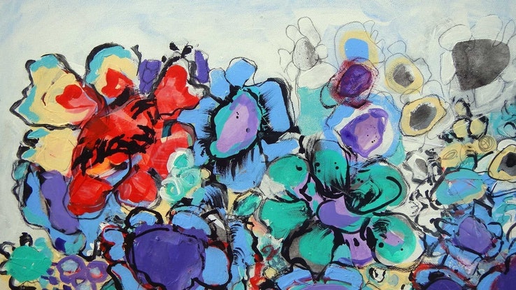 A bold‚ bright semi-abstract composition of flowers in a garden.