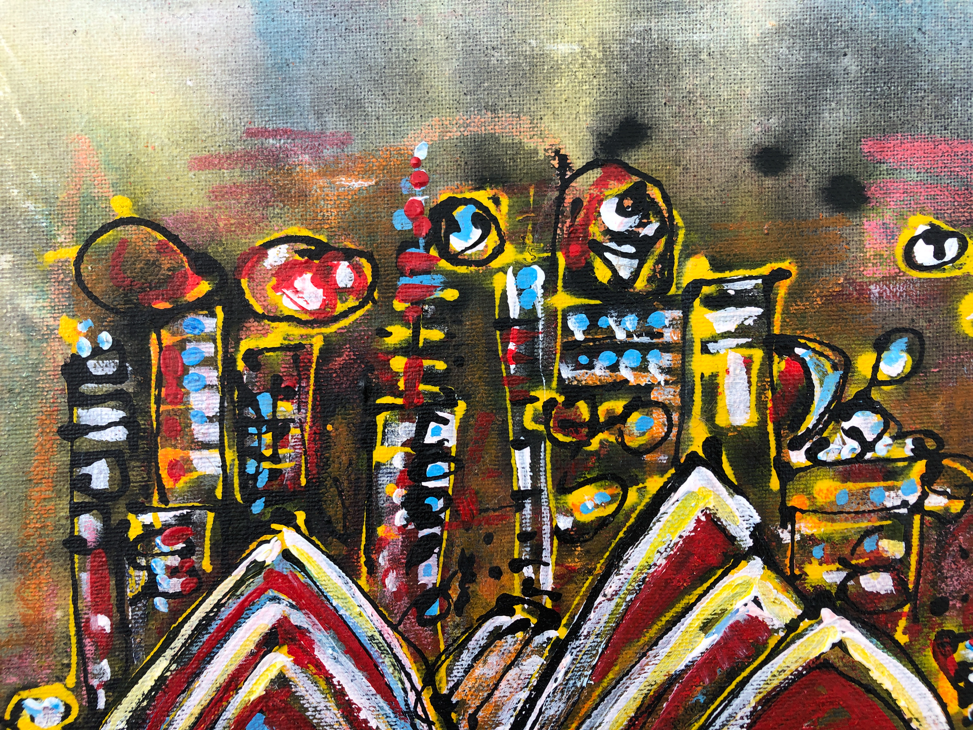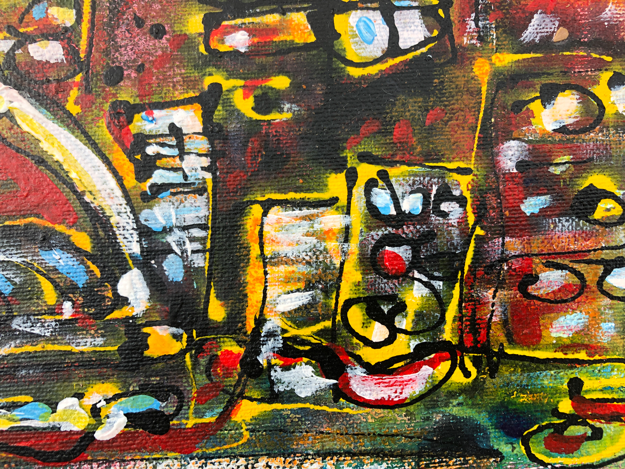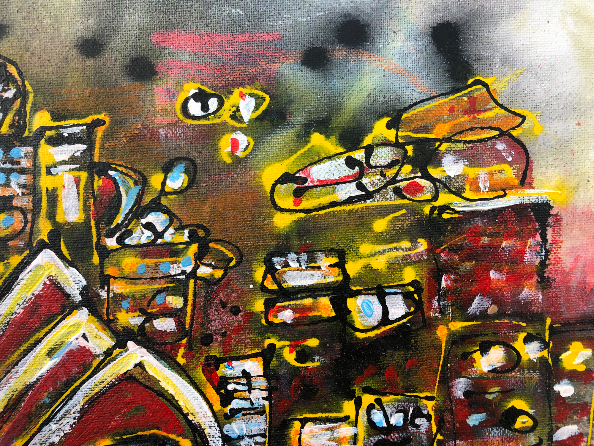 Mixed media including acrylic paint on canvas board (4mm thick). Sealed for protection. Signed on the front.