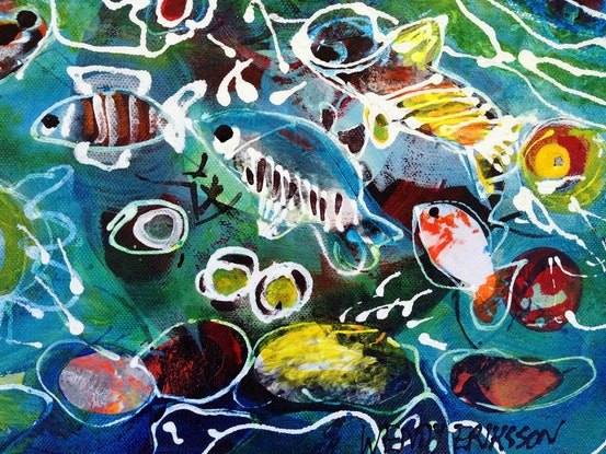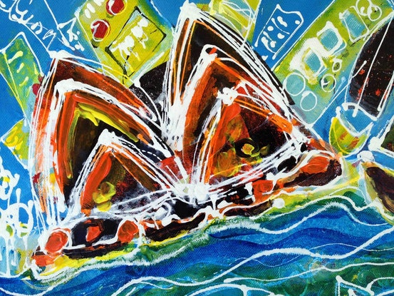 A bold, bright painting depicting life in and under the water at Sydney Harbour.